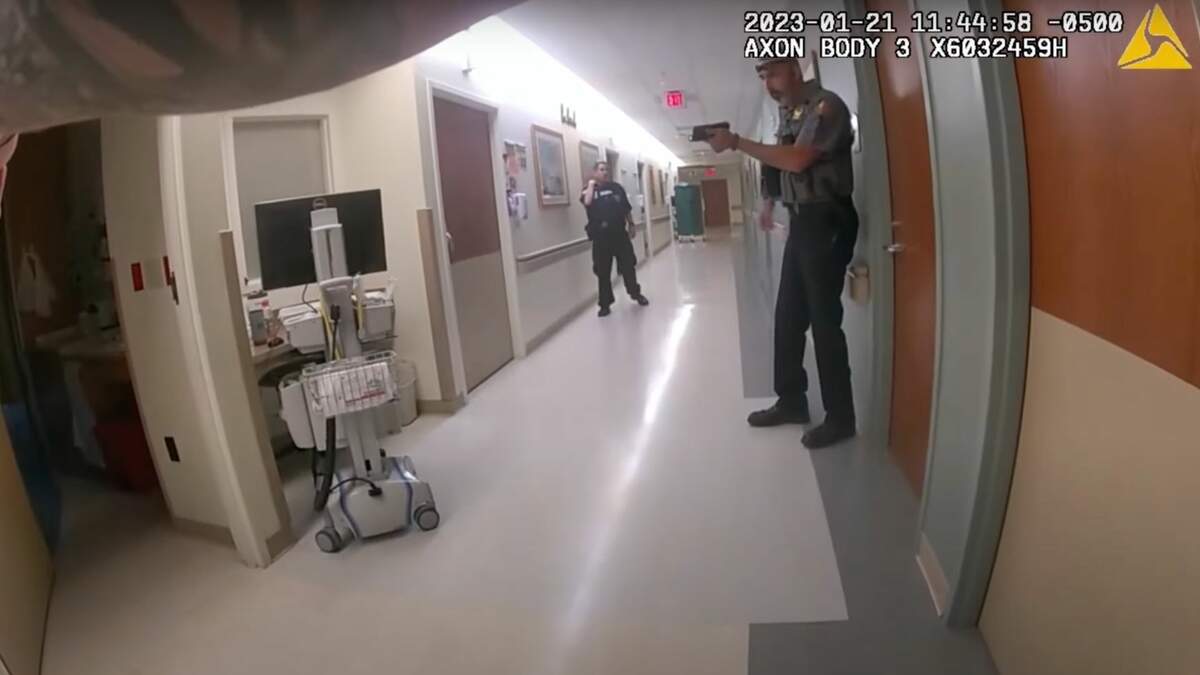 Bodycam footage later cuts to officers escorting Gilland out of the hospital in handcuffs and a wheelchair.